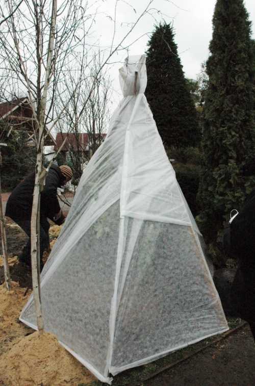 Молодые, но не слишком высокие деревья укрывают с использованием каркаса. Его можно соорудить из подручных средств: