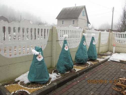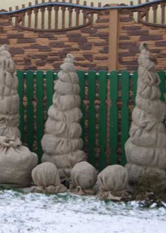 Они сделаны из нетканого материала различной плотности в виде обыкновенных мешков (чаще конусовидной формы) или в виде разнообразных фигур, и обеспечивают защиту от мороза до –9°С, но в весенний период не способны уберечь тую от солнечных ожогов.