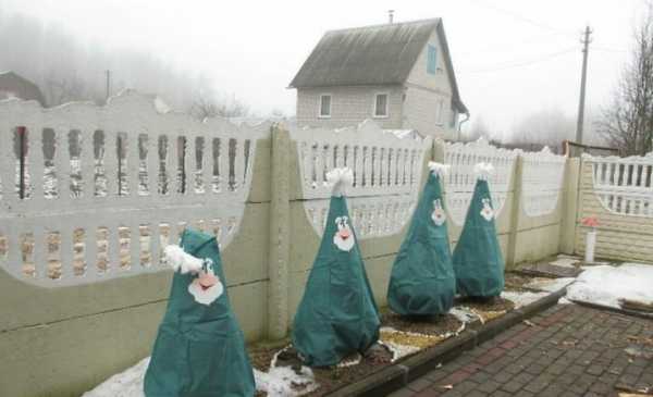 Если нет мешка, подойдёт просто материал для укрытия. Ветви точно так же осторожно связывают, чтобы не травмировать их. Потом можно обернуть материалом и закрепить его, используя верёвки или проволоку. Снег с укрытия надо периодически стряхивать