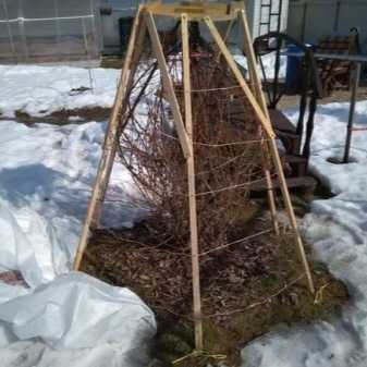 - Трубы, рейки или прутья втыкаются вокруг растения. Верхние концы связываются над верхушкой шпагатом, проволокой. Такая конструкция не позволит скапливаться снегу, даже наоборот способствует его свободному скольжению вниз.