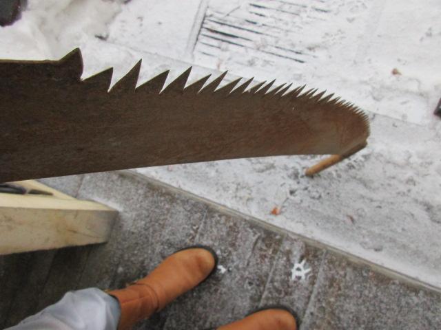 У торцовочной пилы большие зубья по сравнению с другими традиционными ручными пилами. Клинок тоже толстый. В некоторых других местах эту пилу также называют пилой для раскряжевки. В той местности, откуда я родом, это еще называют валочной пилой.