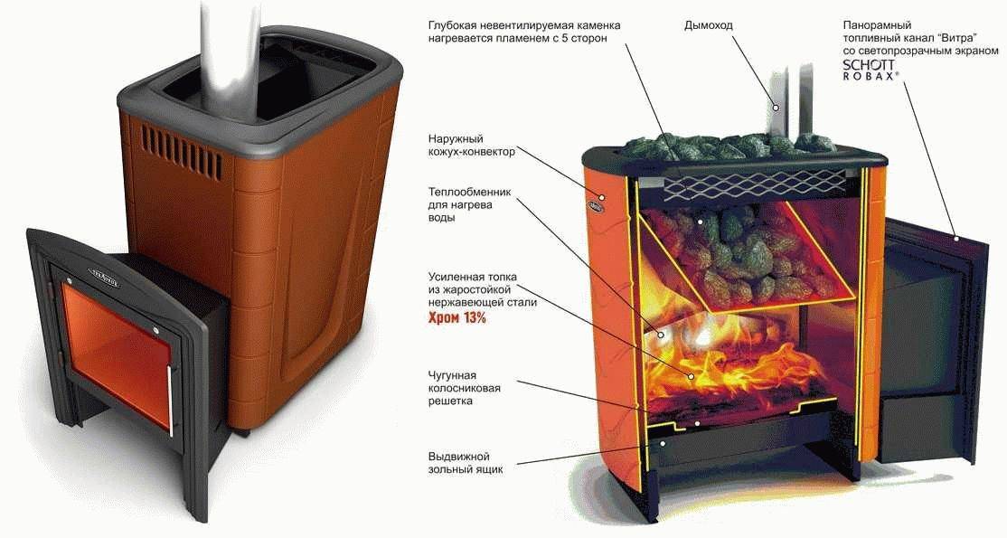 Рынок насыщен различными моделями конструкций, различной формы, вместимости, материала корпуса и топлива, на котором они могут работать.Основная задача печи для бани — нагревать и поддерживать нужную температуру. С этой функцией отлично справятся кухонные плиты. Основные составляющие конструкции — отсек для сжигания топлива и камней, которые долго накапливают и сохраняют тепло.