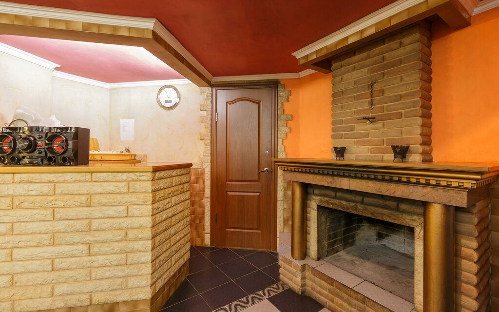 Кирпичная печь-камин – эстетичная внешне отопительная система, которую можно приобрести или построить самостоятельно. Это устройство характеризуется невысоким КПД (70-75%), отличными эксплуатационными характеристиками и эстетичным дизайном. Портал кирпичного сооружения обычно зарывается огнестойким стеклом, чтобы обезопасить посетителей бани от открытого пламени.