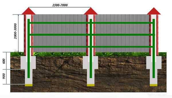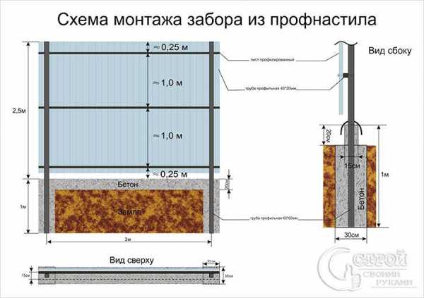 Схема строительства забораНачальный этап состоит в разметке территории. Определите расположение опорных столбов. Шаг между ними должен составлять от 1 до 3 м, в зависимости от длины закупленного профлиста и подвижности почвы на участке. Не забудьте про опорные столбы на калитки и въездные ворота.