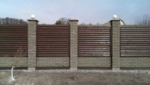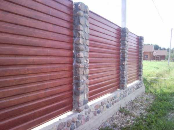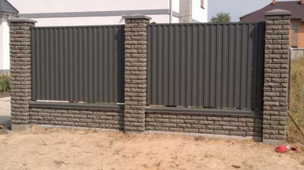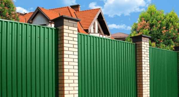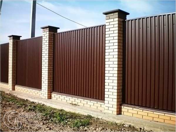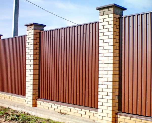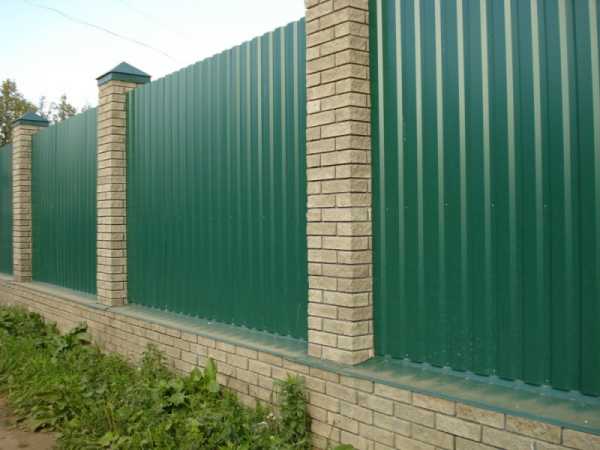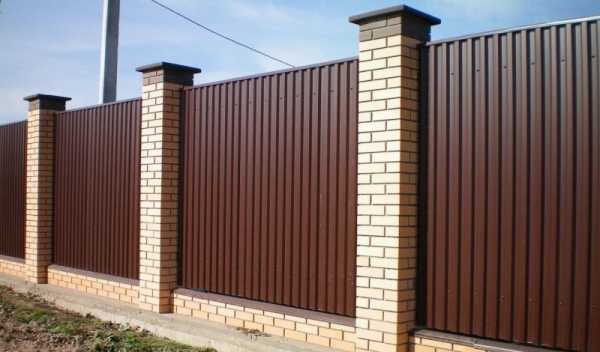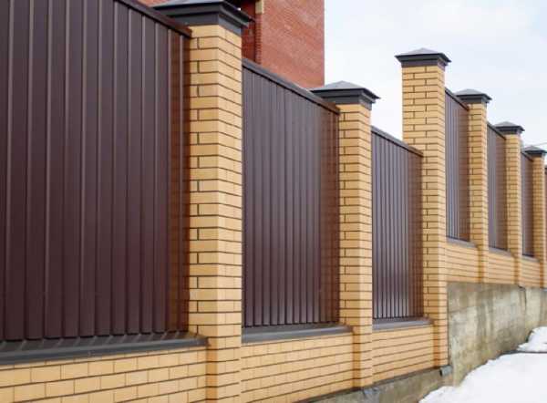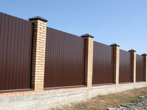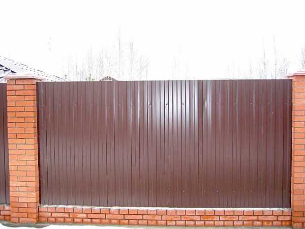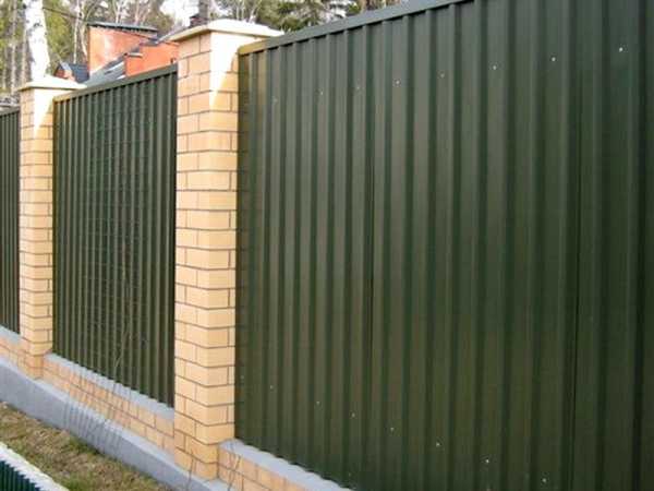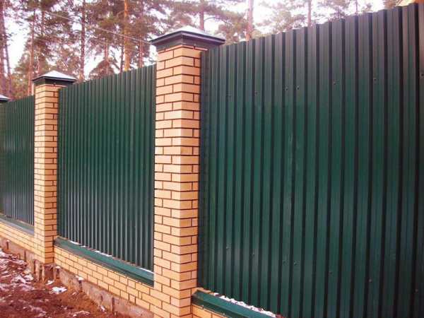 Если же вы хотите построить более монументальное сооружение – можно сделать основание для забора из кирпича, а проемы заполнить листами профнастила.