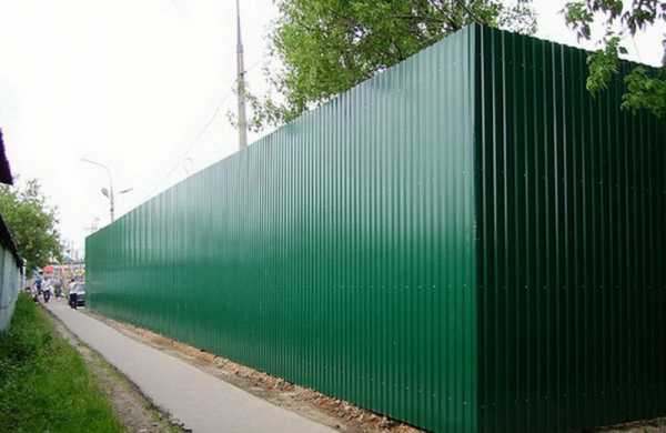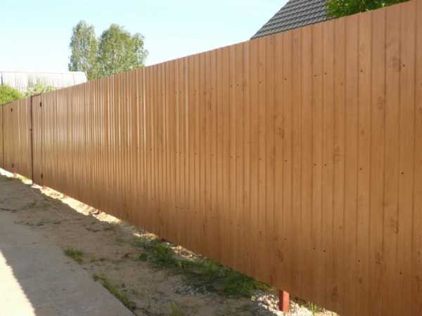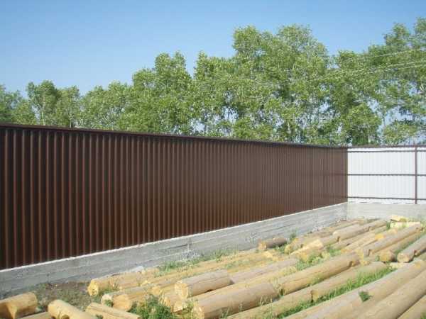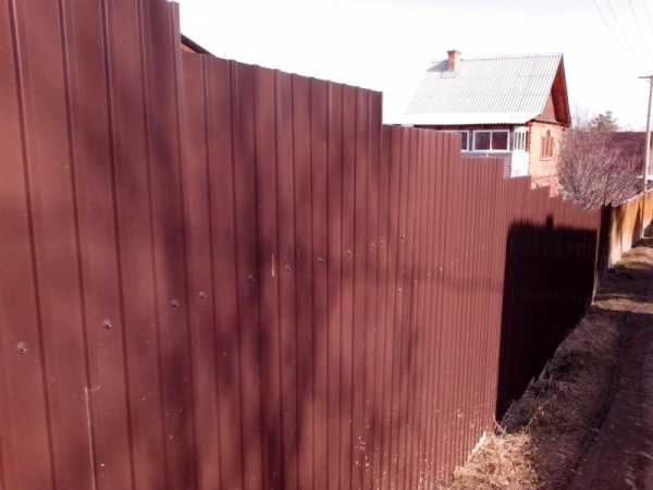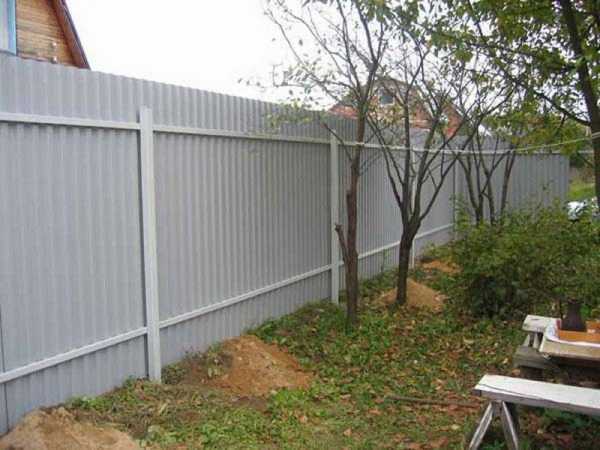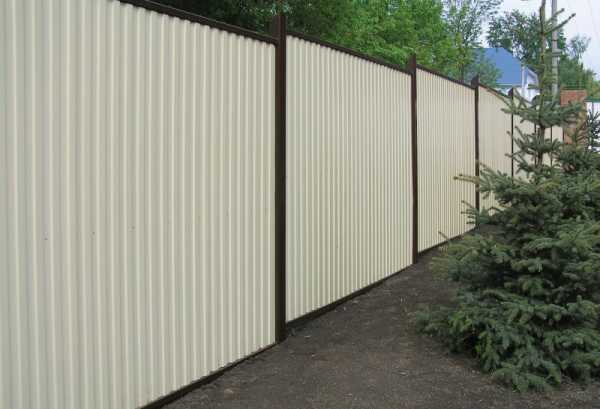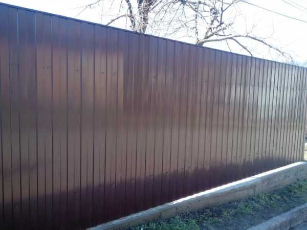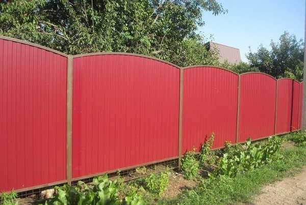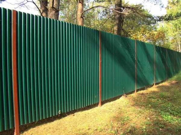 Такой вид ограждения, считается достаточно популярным среди многих дачников. Для этого используют металлические столбы небольшого диаметра, которые вкапывают в грунт. Профнастил на забор приваривают сварочным аппаратом.