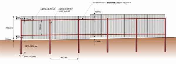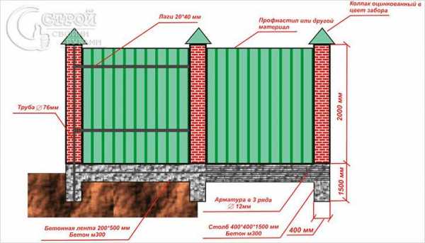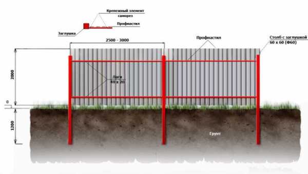 Схема забора из профнастила с кирпичными столбамиЗатем можно устанавливать лаги – поперечный профиль для крепления полотен. Здесь подойдет профилированный брус сечением 40х25 мм или трубы соответствующего диаметра. Количество горизонтальных лаг зависит от величины забора. Если он меньше 1,7 м, достаточно двух рядов. Их крепят с отступом 4 см от верха будущей ограды и от земли. При более высоком заборе количество горизонталей надо увеличить до трех.