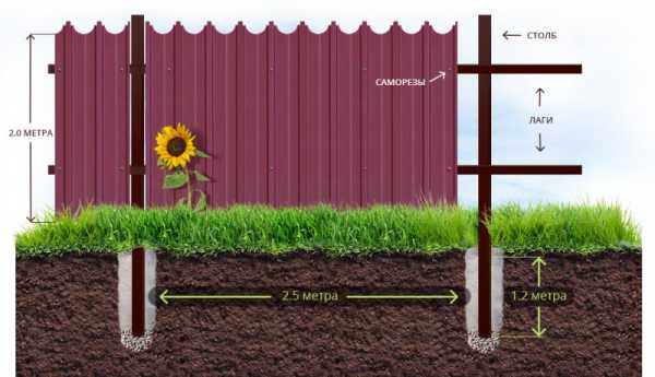 Устройство забора из профнастила предусматривает установку опорных столбов через каждые 2,5 м. Это расстояние считается оптимальным для большинства грунтов при высоте забора до 2,0 м.