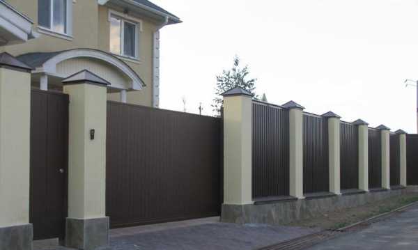 Снаружи такая ограда выглядит солидно и прочно, надежно скрывая дом и придомовую территорию от посторонних взглядов.