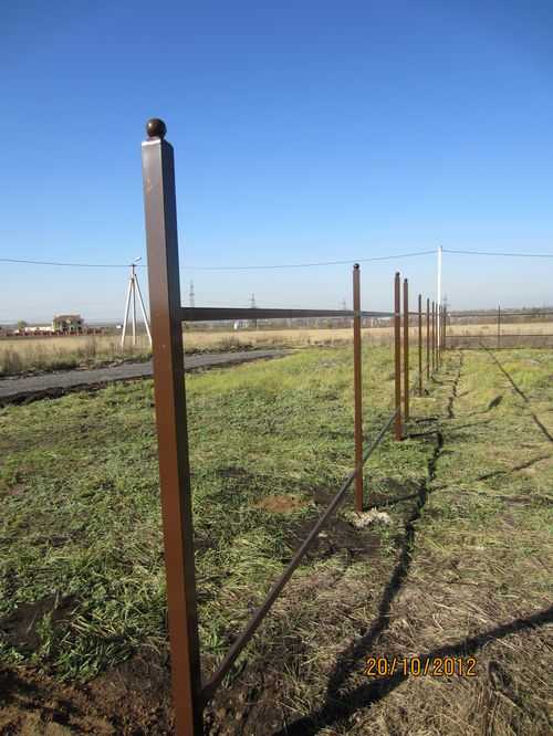 Для забора, высотой меньше 2-х метров, достаточно круглой трубы диаметром 65-76 мм или прямоугольной профильной трубы, сечением 60×60 мм. Длина каждого столба должна быть на 1 м больше высоты ограждения.