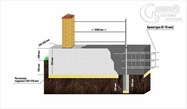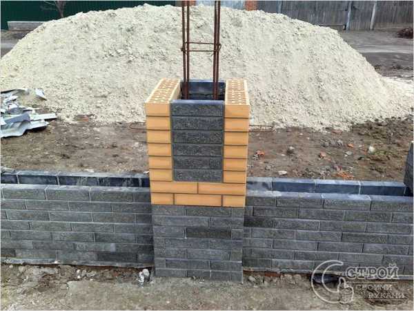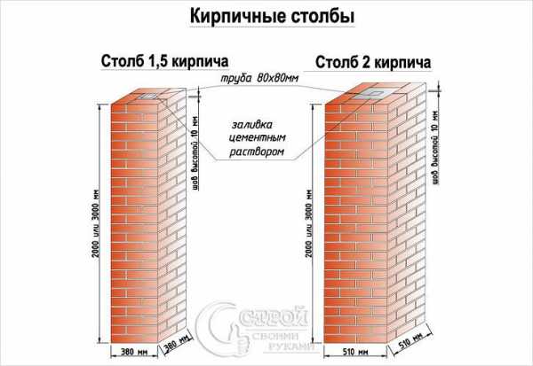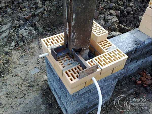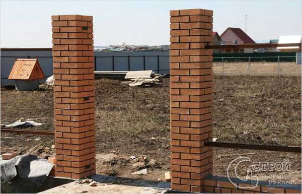 Кирпичный столб с арматуройОбратите внимание! Кирпич также можно использовать как декоративный элемент, обложив им металлические или деревянные столбы.
