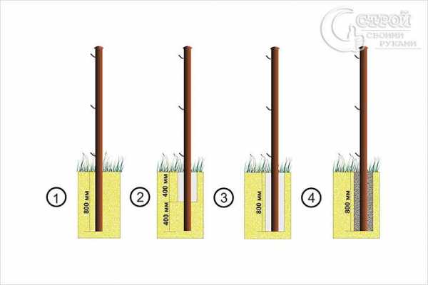 Совет: Можно также использовать бутование по всей глубине или частичную заливку бетоном (на глубину до 40 см). Самым лучшим и наиболее долговечным вариантом считается полное бетонирование. Для этого в подготовленную яму устанавливают трубу и на всю длину заливают бетоном.