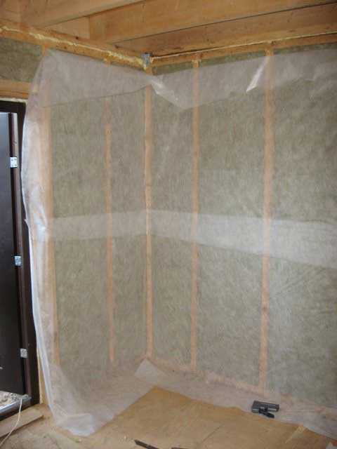 Стержневая часть постройки здания завершена, теперь начинаются работы по утеплению здания. В этих целях нередко применяют минеральные плиты или базальт. Укладывают этот материал изнутри строения, в пространстве между балками. Причем они должны входить в это пространство с трудом. Как только эти работы будут проделаны, можно устанавливать слой пароизоляции.