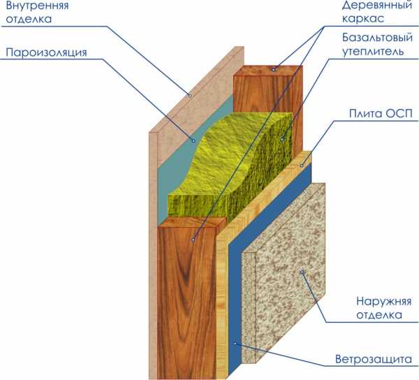 Классическая внешняя стена в каркаснике — это сэндвич, состоящий из внешней отделки, ветрозащиты, плит ОСП, утеплителя, пароизоляции, внутренней отделки и, естественно, самого каркаса.