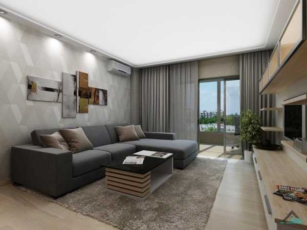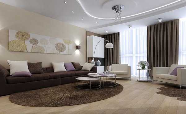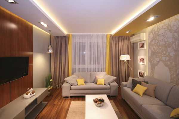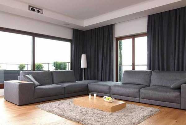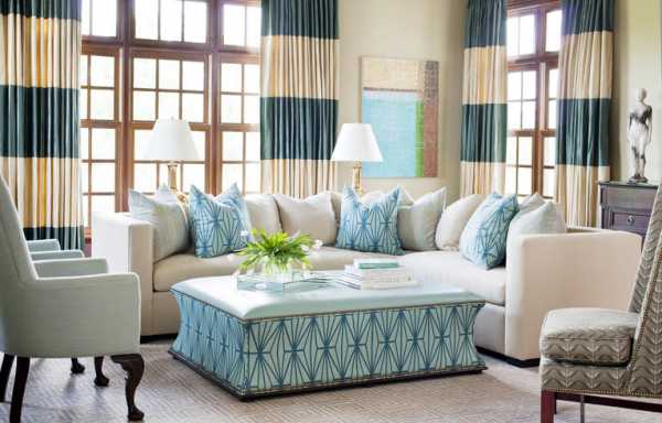 Нередко сегодня встречаются гостиные с низкими потолками. Визуально подкорректировать этот недостаток помогут шторы с вертикальным рисунком, закрепленные на потолочном карнизе.