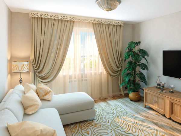 На фото пример штор для зала на потолочном карнизе с жестким ламбрекеном. Такой вариант оформления смотрится очень стильно и скрывает сам карниз.