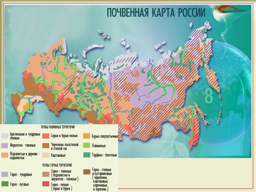 Каждая климатическая зона или природная зона России характеризуется особым составом почв. На него влияет климат, рельеф, флора и фауна. Плодородие почвы варьируется в зависимости от региона, а также количества питательных элементов. Расстояние между крайними географическими точками России достаточно велико, на ее территории расположено несколько климатических и природных зон, поэтому почвенный состав страны характеризуется разнообразием.