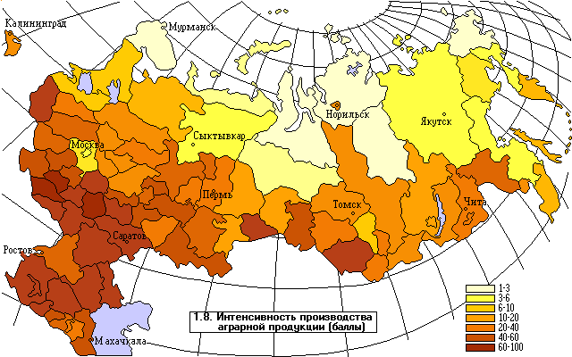 Далеко не все земли страны пригодны для сельскохозяйственной деятельности, часть из них находится в арктическом и субарктическом поясе. Большинство земледельческих угодий расположено в Центрально-Черноземном районе. На Дальнем Востоке земледелие развито слабо.