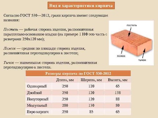 Хоть и существует такая разнообразность видов данного камня, но все его размеры зависят от неких параметров, названия которых сегодня диктуются ГОСТом. Постель, ложок и тычок обозначают плоскости сторон кирпича. Эти три параметра важные определители его размера.