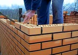 На первом этапе возведения сооружений следует установить в углах по отвесу порядовки. При строительстве кладка углов должна опережать возведение стен на 3-4 ряда. Для выполнения перевязки швов по углам используются не только полномерные кирпичи, но также и куски по половине и четверти.