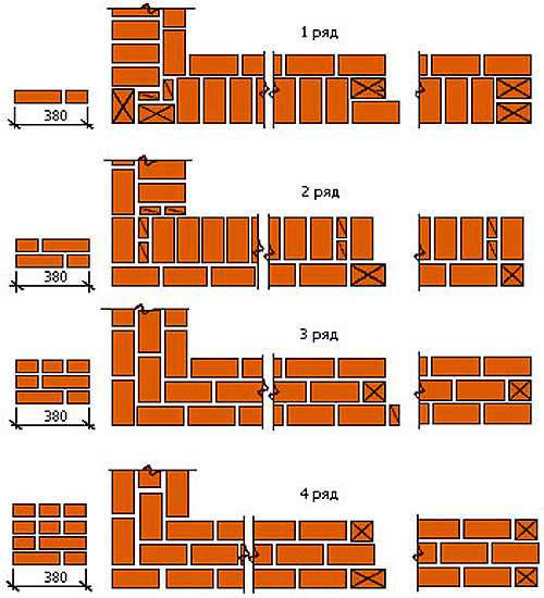 При строительстве стен в 1,5 кирпича (380 мм) схема кладки углов будет несколько более сложная.