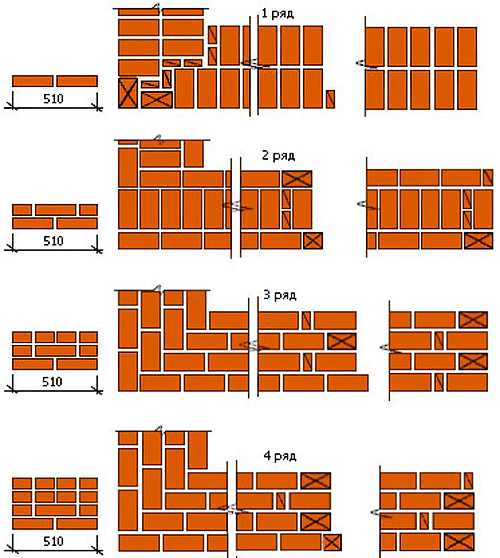 При необходимости выполнения кладки в 2 кирпича (510 мм) углы выкладываются так, как показано на рисунках ниже.