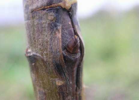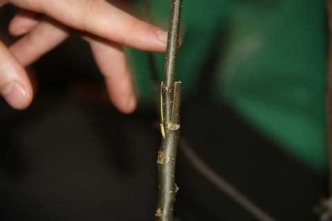 - Над срезом у привоя желательно иметь здоровую почку, т. к. это стимулирует развитие ветви. Кроме того, если черенок сломается, из этой почки можно отрастить новый сортовой побег.