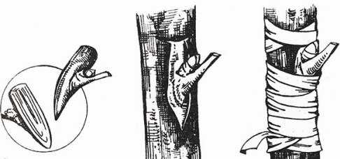 Сбоку дерева вырезается сужающаяся книзу щель, куда вклинивается обрезанный на 2 почки и срезанный с двух сторон по косой привой. После этого растение обвязывают и обрабатывают садовым варом.