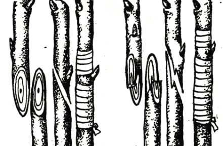 Метод копулировки черенком удобен, когда привой и подвой имеют сходную толщину. На них делают под углом около 30° длинные косые срезы и соединяют их. Затем соединенный участок тщательно перевязывают и обмазывают варом.