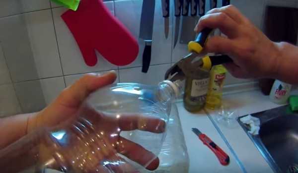 ΠΠ·Π³ΠΎΡΠΎΠ²ΠΈΡΡ ΡΠ°ΠΊΠΎΠΉ Π²ΠΈΠ΄ ΠΊΠΎΡΠΌΡΡΠΊΠΈ ΠΎΡΠ΅Π½Ρ ΠΏΡΠΎΡΡΠΎ. ΠΠ»Ρ Π½Π°ΡΠ°Π»Π° Π½ΡΠΆΠ½ΠΎ Π²Π·ΡΡΡ Π»ΡΠ±ΡΡ ΠΏΠ»Π°ΡΡΠΈΠΊΠΎΠ²ΡΡ Π±ΡΡΡΠ»ΠΊΡ, (ΠΎΠΏΡΠΈΠΌΠ°Π»ΡΠ½ΡΠΌ ΡΠ°Π·ΠΌΠ΅ΡΠΎΠΌ ΠΌΠΎΠΆΠ½ΠΎ ΡΡΠΈΡΠ°ΡΡ Π΄Π²ΡΡ Π»ΠΈΡΡΠΎΠ²ΡΡ) ΠΎΡΠ²ΠΎΠ±ΠΎΠ΄ΠΈΡΡ ΠΎΡ ΡΠΎΠ΄Π΅ΡΠΆΠΈΠΌΠΎΠ³ΠΎ, Π΅ΡΠ»ΠΈ ΠΎΠ½ΠΎ ΠΈΠΌΠ΅Π΅ΡΡΡ, ΠΈ ΡΠ΄Π΅Π»Π°ΡΡ βΠΎΠΊΠ½ΠΎβ Π½Π° ΠΎΠ΄Π½ΠΎΠΉ ΠΈΠ· ΡΡΠ΅Π½ΠΎΠΊ Π±ΡΡΡΠ»ΠΊΠΈ. Π§Π΅ΠΌ ΠΎΠΊΠΎΡΠΊΠΎ Π±ΡΠ΄Π΅Ρ Π±ΠΎΠ»ΡΡΠ΅, ΡΠ΅ΠΌ Π»ΡΡΡΠ΅. ΠΠ»Π°Π²Π½ΠΎΠ΅, ΡΡΠΎΠ±Ρ ΠΏΡΠΎΡΠ΅Π·Ρ Π±ΡΠ»Π° ΠΏΠΎΠ»Π½ΠΎΠΉ, ΡΠ°ΠΊ ΠΊΠ°ΠΊ Π½Π΅ΠΊΠΎΡΠΎΡΡΠ΅ Π΄ΠΎΠ±ΡΠΎΡΠ΅ΡΠ΄Π΅ΡΠ½ΡΠ΅ Π³ΡΠ°ΠΆΠ΄Π°Π½Π΅ ΠΏΡΠΎΡΠ΅Π·Π°ΡΡ Π²ΡΠ΅Π³ΠΎ ΡΡΠΈ ΡΡΠΎΡΠΎΠ½Ρ ΠΈ ΠΎΡΠ³ΠΈΠ±Π°ΡΡ Π²ΡΡΠ΅Π·Π°Π½Π½ΡΡ ΡΠ°ΡΡΡ Ρ Π±ΡΡΡΠ»ΠΊΠΈ, ΡΠ°ΠΊΠΈΠΌ ΠΎΠ±ΡΠ°Π·ΠΎΠΌ ΠΏΠΎΠ΄Π²Π΅ΡΠ³Π°Ρ ΠΏΡΠΈΡ ΠΎΠΏΠ°ΡΠ½ΠΎΡΡΠΈ.