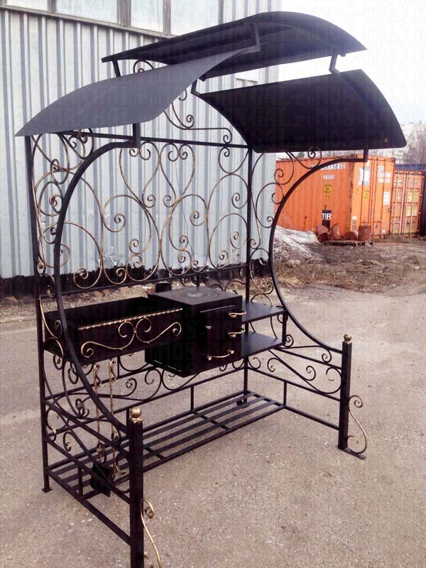 Превосходные недорогие мангалы с крышей вместе с коваными деталями скамеек, мебели и беседок составляют роскошный ландшафтный ансамбль.