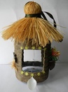 Бутыль обматывается мешковиной, проклеивается, окрашивается. Сверху надевается пучок соломы, имитируя крышу, в виде аппликаций крепятся цветы.
