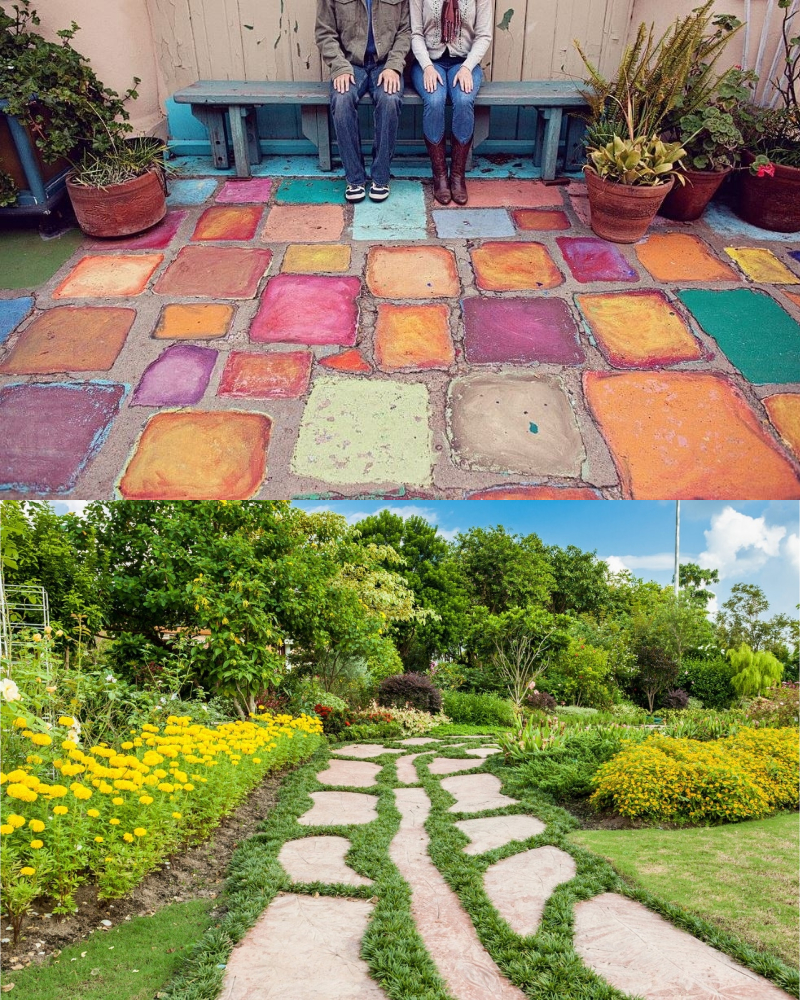 Большинство дачников на своих участках делает дорожки из монолитного бетона. Они надежные и прочные. А чтобы их вид не был однообразным и невзрачным, их декорируют различными способами.