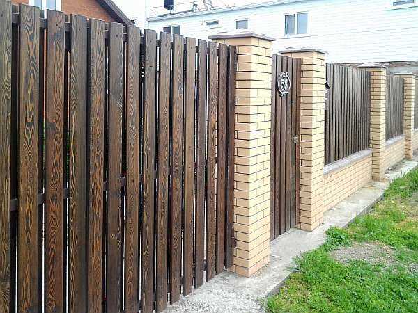Можно использовать необрезные доски и просто покрашенные, а если их обработать брашированием и покрыть специальными составами, результат превысит любые ожидания. Также можно сделать любой плетеный забор из обожженной доски. Если есть специальное оборудование и необходимые навыки, лучше обжигать пиломатериал самостоятельно.