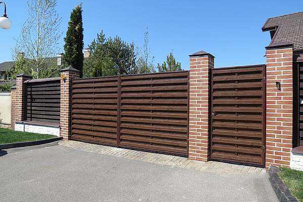 - Фасадные – призваны защитить внутреннюю территорию от посторонних взглядов, несанкционированного проникновения. Это вертикальные решетчатые конструкции или штакетник, «ранчо» (с горизонтальной обшивкой), лестничные варианты, где доски располагаются внахлест, шахматные, в которых детали монтируются в два ряда со смещением, «частокол», создаваемый из заостренных колышков, а также варианты, где планочки переплетены прочной веревкой;