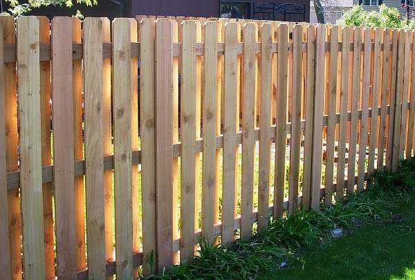 Такое расположение частично пропускает и солнечный свет и становится основой для вьющихся растений. Забор-лесенка состоит из планок, расположенных под небольшим наклоном и перекрывающих друг друга. В отличие от первого варианта больших зазоров между планками нет.