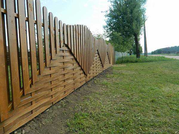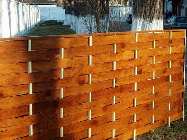 Еще одним довольно необычным типом является плетенка. Эта ограда выглядит красиво и оригинально. Для плетения необходимы доски не больше 25 мм толщиной и в пределах 10 см шириной. Вариантов их переплетения несколько: