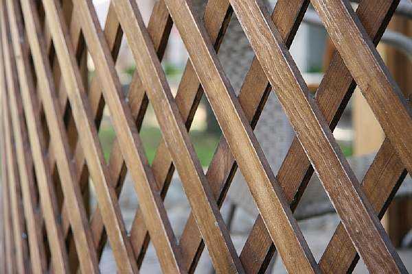 - Плетенка классическая. Деревянные ламели перекрещиваются и скрепляются друг с другом, образуя ромбовидный рисунок-сетку, напоминающий стенки беседки и крепятся к несущим столбам.