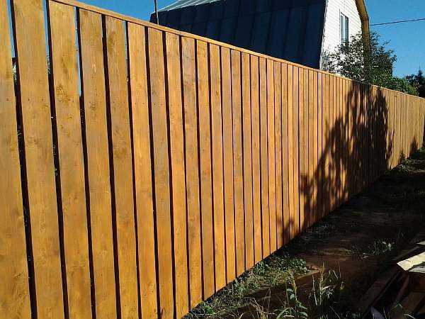 Перед установкой забора стоит отшлифовать доски, пропитать защитными материалами, при желании тонировать и в конце покрыть лаком, что сделает забор эстетически привлекательным и долговечным. Тогда он будет сочетаться и выигрышно смотреться с деревянным домом и постройками.