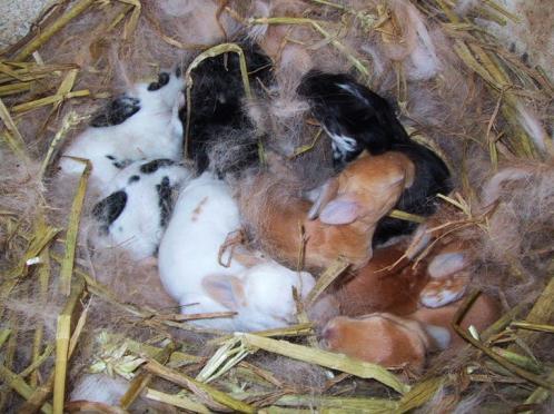 В первые несколько дней крольчата абсолютно беззащитны: на их телах нет шерсти, они ничего не видят и не слышат. Примерно на 5 день они покрываются лёгким пушком, а через неделю после появления на свет удваивается их вес. На 10 сутки у малышей открываются глазки, и юные кроликиначинают познавать мир. До этого момента они полностью дезориентированы. Если кто-то выпал из гнезда, то велик риск того, что он погибнет. Крольчиха не станет перетаскивать малышей обратно в маточник.
