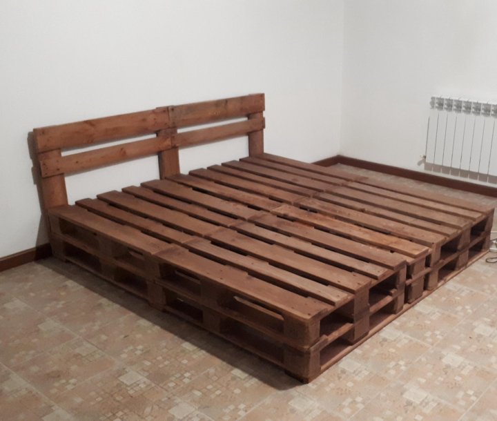 Такой материал наименее подвержен гниению при воздействии влажности. Конечно, древесина должна быть хорошо просушена и не иметь трещин, других серьезных повреждений. Доски для надежности желательно скреплять саморезами. После изготовления паллетов из дерева можно приступать к сборке спального ложа.