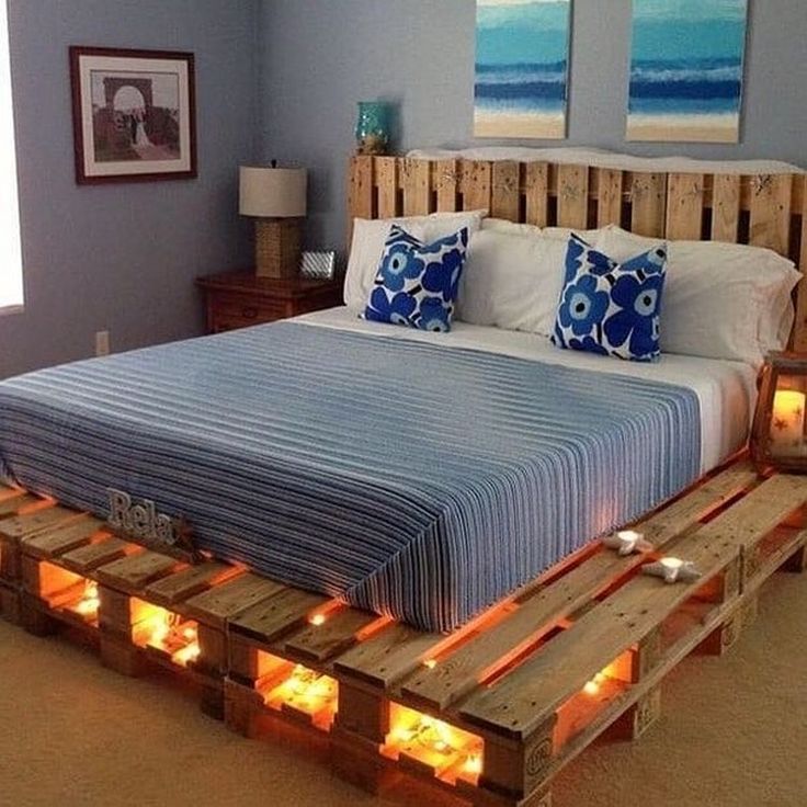 Одна из лучших особенностей кровати из поддонов заключается в том, что под ней легко вставить светильники из-за зазора, который позволяет свету проходить через всю комнату и распространять действительно уютную атмосферу по комнате.