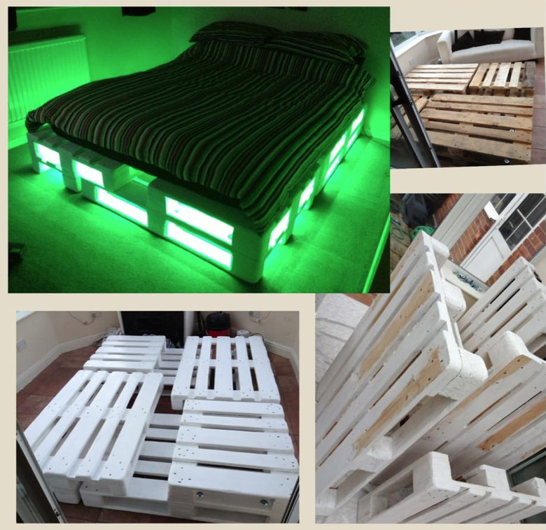 Этот единственный в своем роде каркас кровати изготовлен из перепрофилированных поддонов, которые были отремонтированы и окрашены. Четыре поддона, соединенные вместе, обеспечивают достаточно места для двуспальной кровати и многого другого. Дополнительный выступ может служить прикроватной тумбочкой.