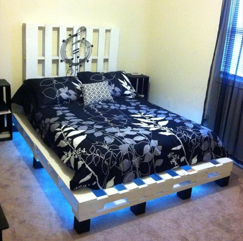 Нам просто нравится эта комбинация между поддонами, окрашенными в белый цвет, и синими огнями, установленными под ними и видимыми через промежутки. Вы можете в основном добавить кучу светодиодов внизу для максимального эффекта.