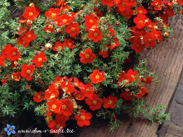 Лапчатка. Неприметное растение, цветет многочисленными, но некрупными цветками, листва не особенно красива. Тем не менее, без лапчатки не обходится ни один кустарниковый бордюр или миксбордер: в то время как другие кустарники поочередно отцветают, она создает в саду яркое пятно. Они зарекомендовали себя как кустарники цветущие все лето, зимостойкие, так как на боятся заморозков. Цветение начинается в мае и прекращается с первыми морозами. К почве неприхотлива, хорошо цветет как на солнечном месте, так и в легкой полутени, уход сводится к ежегодной обрезке. Есть сорта этого непрерывно цветущего кустарника разной окраски.