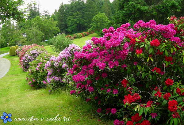 Рододендроны — великолепно цветущие красивые кустарники, которые к тому же предпочитают быть укрытыми от полуденного солнца. Традиционно представителей рода подразделяют на рододендроны и азалии. Рододендроны, растущие в тени в среднем достигают в высоту 1,5 метра, цветут в мае, однако есть растения как 30 см, так и 6 м, цветущие как ранней весной, так и осенью, в августе. Окраска цветов разноообразна, за исключением голубой, листья овальные или продолговатые, зимующие. Для всех рододендронов характерно неглубокое залегание корней, поэтому почву под растениями мульчируют, в сухую погоду обильно поливают.