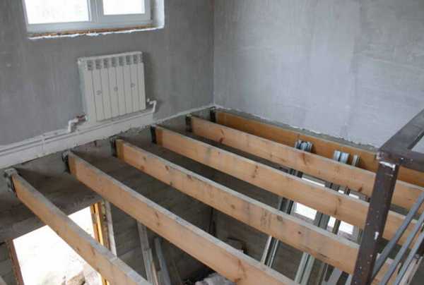 Конструкция из настила и лагов применяется в комнатах с высокими потолками, т.к. брусья поднимают настил. Она может монтироваться на любой стадии строительства, даже в жилом доме.