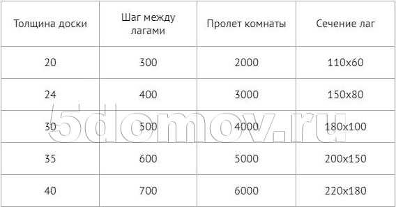 Сечение лагов зависит от расстояния между балками и вычисляется по специальным таблицам. Если ширина пролета имеет промежуточное значение, выбирайте лаги больших размеров.