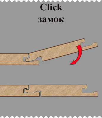 - Самой совершенной является система «Сlick»—замков. Сложная фигурная конструкция пазов и шипов позволяет произвести соединение только под определенным углом. Затем, при повороте панелей в одну плоскость, происходит полное надежное закрытие, сопровождающееся характерным звуком – кликом, что, в сущности, и дало название замку.