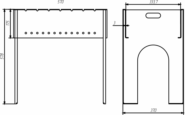На рисунке показан простейший мангал. Размеры можно изменять исходя из собственных предпочтений. Но разметку отверстий в нижней части стенок и верхних надпилов под шампуры желательно сохранить.